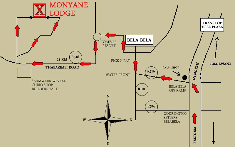 - Proceed straight for 21km and look out for Building Supply depot and Saamwerk curio shop on your left. Turn right onto the gravel road opposite Saamwerk and call the Monyane Reception number 064 751 5587 to open the gate for you.